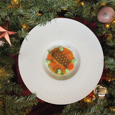 aardappelmousseline met truffel | gebrande wortel en bimi | tomaat | gevogeltesaus